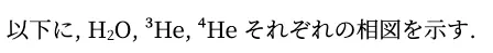 以下に, H2O, ^3He, ^4He それぞれの相図を示す.